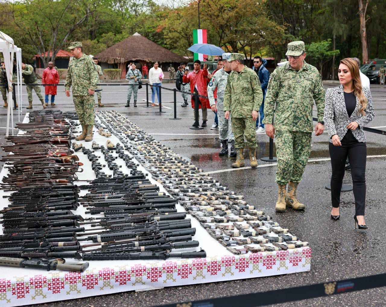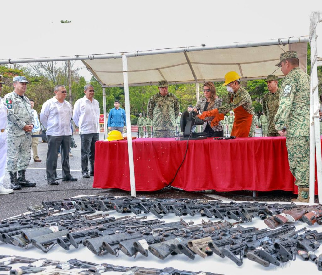 Durante la ceremonia, realizada en las instalaciones de la 35 Zona Militar, la mandataria estatal presenció la destrucción de un total de 620 armas, de las cuales 367 son cortas y 253 largas, así como 66,966 cartuchos de diferentes calibres y 1,208 cargadores.