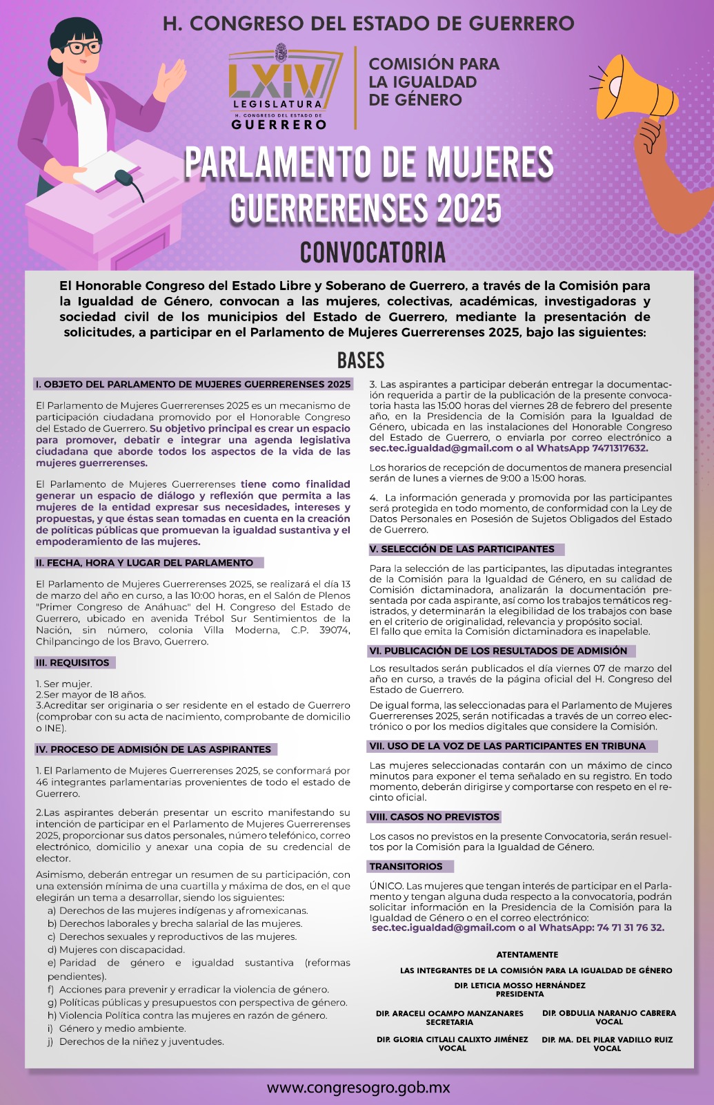 Chilpancingo, Gro., 04 de febrero de 2025.- El Congreso del Estado de Guerrero, a través de la Comisión para la Igualdad de Género, invita a las mujeres guerrerenses a participar en el Parlamento de Mujeres 2025, a realizarse el próximo 13 de marzo con el objetivo de construir y fortalecer una agenda legislativa para erradicar todos los tipos de violencia y garantizar sus derechos, contribuyendo al pleno desarrollo de su vida.