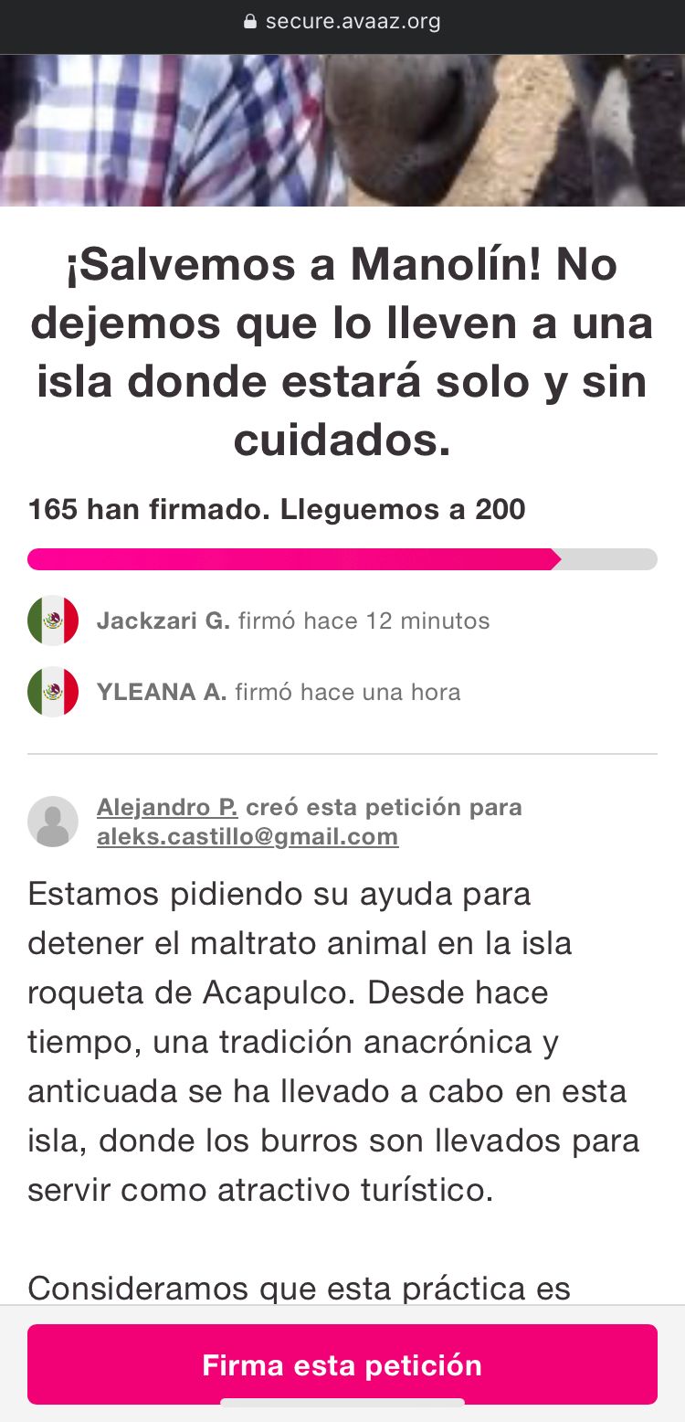 La petición que se encuentra en la plataforma secure.avaaz.org busca crear conciencia y erradicar el maltrato animal en la Isla de la Roqueta del puerto de Acapulco y que hasta el momento ha recaudado 166 firmas.