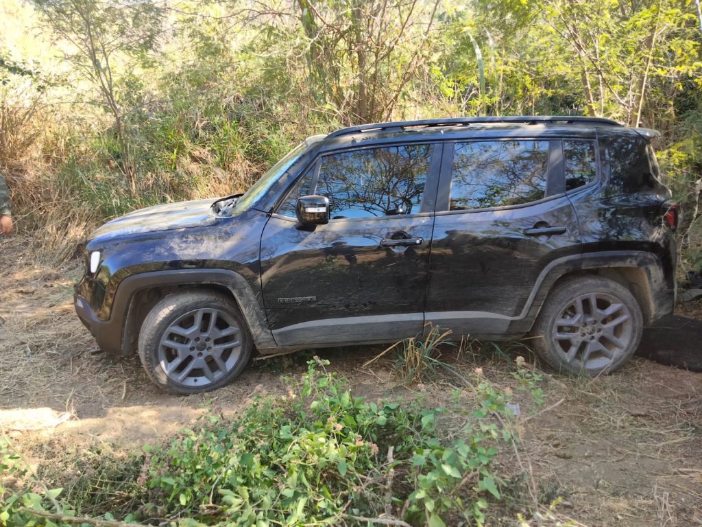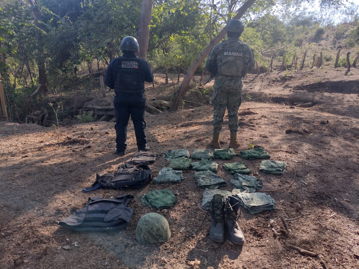 Así como, un vehículo modelo Jeep, modelo Renegade, con placas de circulación del estado de Guerrero; en su interior se localizó equipo táctico compuesto por siete uniformes pixelados, un casco, dos chalecos balísticos y una porta placa.