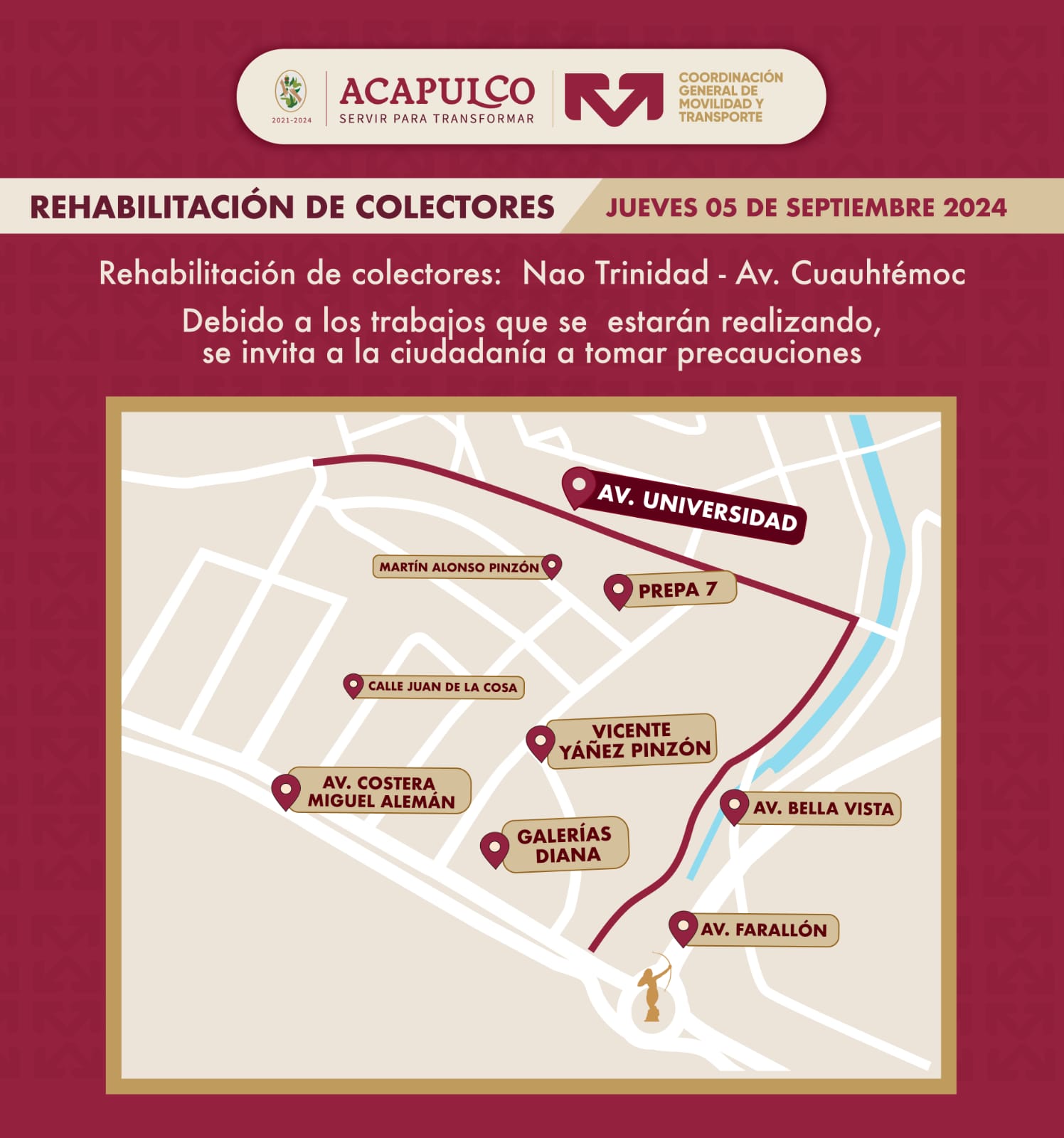 Acapulco, Gro., 04 de septiembre de 2024.- El Gobierno Municipal de Acapulco hace el llamado a la población a prever sus tiempos de traslado ante el cierre temporal en un tramo de la avenida Universidad, por trabajos de “Rehabilitación del colector Nao Trinidad – Avenida Cuauhtémoc, tercera etapa de cinco”.
