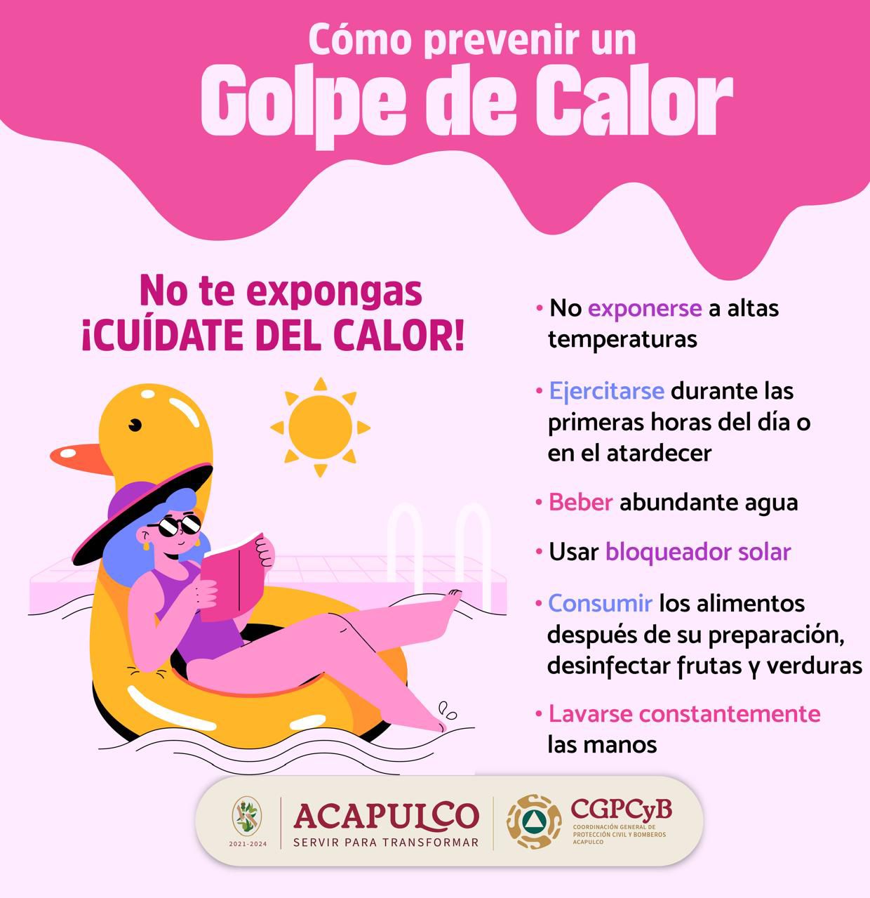 Acapulco, Gro., 11 de junio del 2024.- Para evitar golpes de calor generados por las altas temperaturas que se registran en el estado y el país, el Gobierno Municipal encabezado por Abelina López Rodríguez, exhorta a las y los ciudadanos a mantenerse hidratados y seguir las recomendaciones del sector salud.