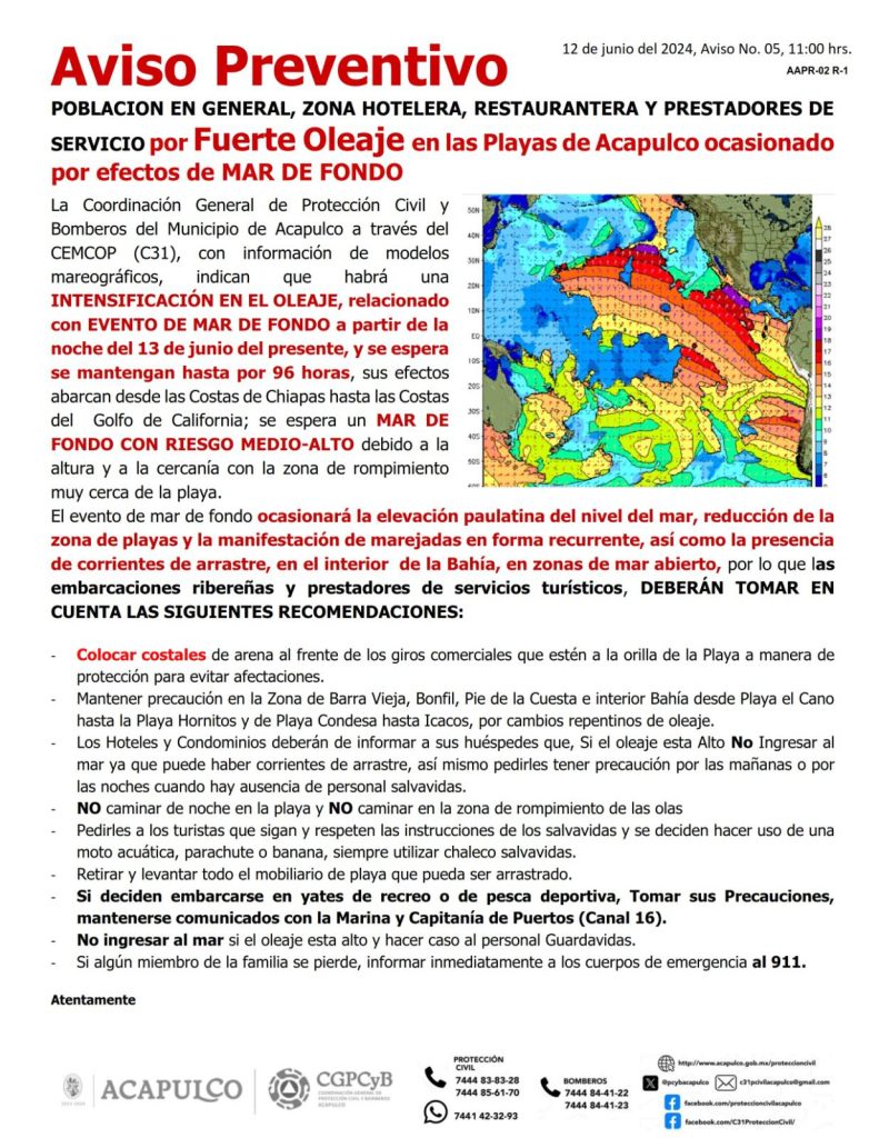La Coordinación General de Protección Civil y Bomberos de Acapulco, con información de modelos mareográficos, indica que se espera se intensifiquen los efectos del evento de mar de fondo que se presenta en playas de Acapulco.