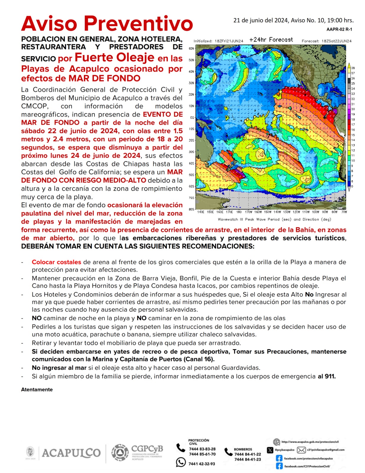La Coordinación General de Protección Civil y Bomberos del Municipio de Acapulco, con información de modelos mareográficos, indica presencia de evento de mar de fondo a partir de la noche del sábado 22 al lunes 24 de junio.