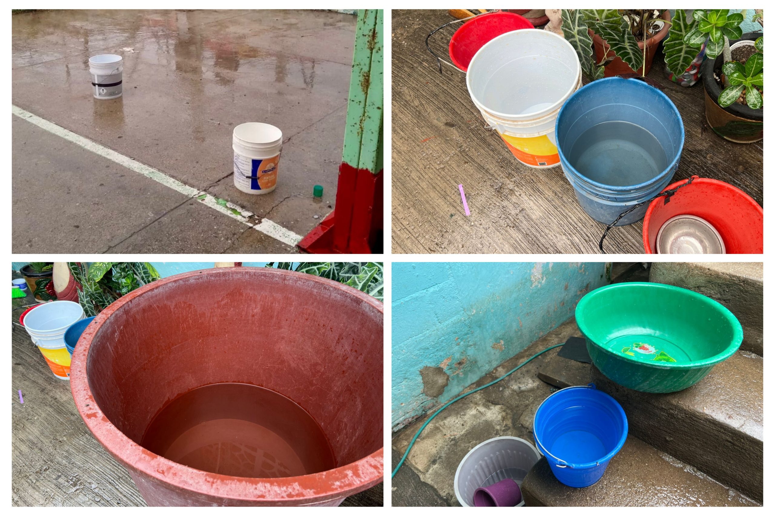 En distintas zonas del puerto, los residentes los vecinos han colocado cubetas y recipientes para recoger el preciado líquido, ante la nula respuesta de la autoridad municipal para dotar del servicio que se paga puntualmente.