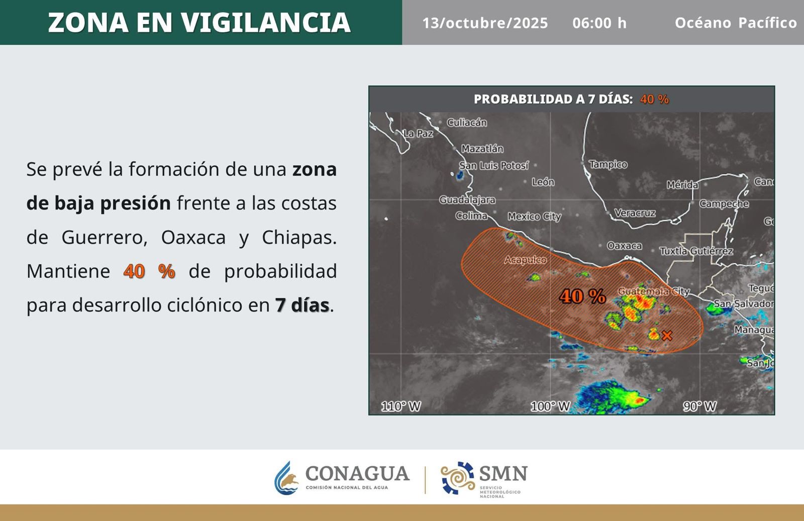 Con base en información de la Comisión Nacional del Agua (Conagua), el centro de monitoreo de la dependencia indicó que esta zona presenta un 40 por ciento de probabilidad de desarrollo ciclónico en el pronóstico a siete días.