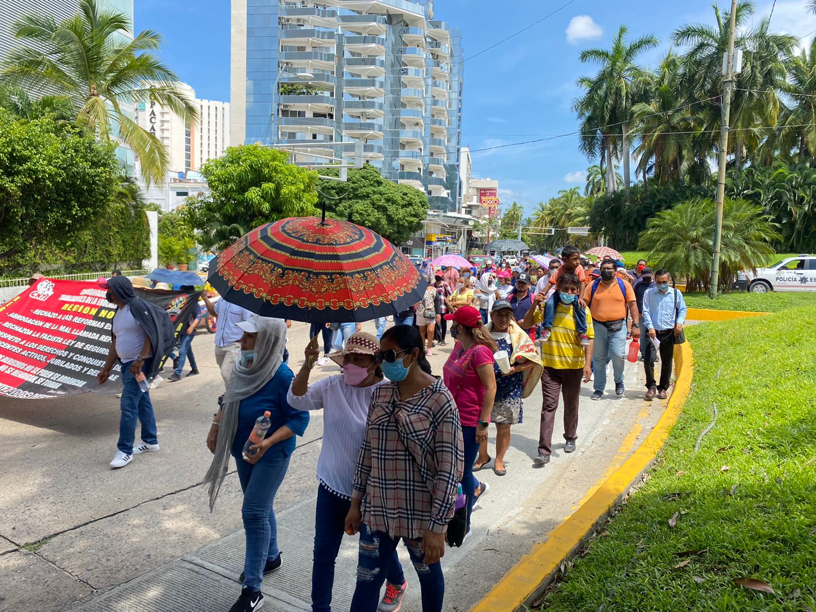 Acapulco,Gro., a 08 de julio del 2022.-Para exigir la basificación de docentes que trabajan por contrato, maestros de la Coordinadora Estatal de Trabajadores del Estado de Guerrero decidieron marchar sobre la costera Miguel Alemán para generar presión a las autoridades estatales.