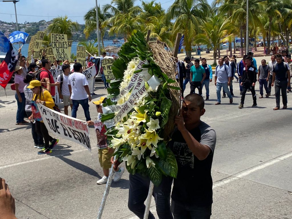 Acapulco,Gro., a 25 de agosto del 2022.- La mañana de este jueves, estudiantes de la Escuela Normal Rural Raúl Isidro Burgos de Ayotzinapa, marcharon sobre la avenida costera Miguel Alemán de Acapulco, sobre el carril sentido Zócalo-Base, para después colocar una ofrenda floral en el antimonumento a los 43 desaparecidos para conmemorar los casi ocho años de los hechos en Iguala de la Independencia.