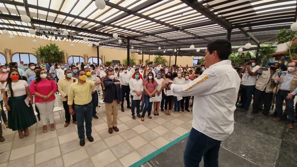 Chilpancingo, Gro., 25 de marzo del 2021.- El candidato a gobernador del PRI-PRD, Mario Moreno Arcos, le tomó protesta a la estructura de campaña de la coalición y entregó más de 150 nombramientos a las mujeres y a los hombres que en equidad de circunstancias, coordinarán los esfuerzos regionales y municipales en esta “campaña ganadora” .