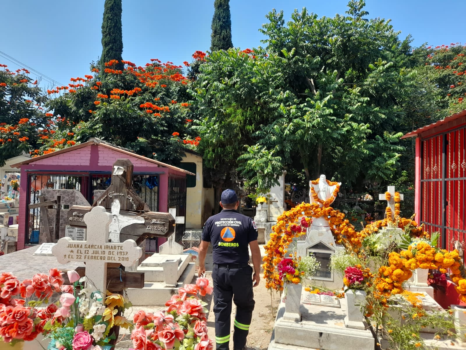 El 1 y 2 de noviembre, días de mayor afluencia de personas que visitan los panteones de la entidad, se brinda seguridad con unidades y personal de Atención a Emergencias de la Secretaría de Protección Civil, en coordinación con autoridades municipales de Protección Civil y Cruz Roja, para atender cualquier incidencia que se presente.