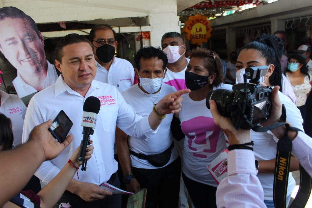 Acapulco, Guerrero, 14 de mayo de 2021.- El candidato a la presidencia de Acapulco por el partido Fuerza por México José Alberto “El Güero Alonso” recorrió las instalaciones del mercado popular de la colonia 20 de noviembre, donde escuchó las peticiones de los locatarios y aseguró, que durante su gobierno, habrá una mayor inversión para garantizar el mejoramiento integral de los mercados del municipio.