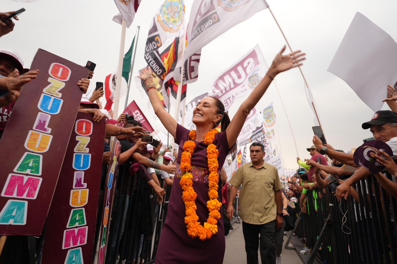 La candidata presidencial estuvo acompañada en el presídium por las y los candidatos a las gubernaturas de Chiapas, Eduardo Ramírez; de Guanajuato, Alma Alcaraz; de Jalisco, Claudia Delgadillo; de Morelos, Margarita González; de Puebla, Alejandro Armenta; de Tabasco, Javier May; de Veracruz, Rocío Nahle; y a la Jefatura de Gobierno de la Ciudad de México, Clara Brugada; así como las y los candidatos de la Cuarta Transformación al Senado de la República.
