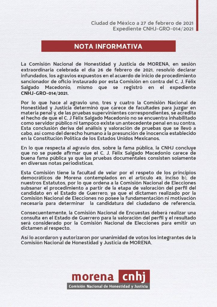 La Comisión Nacional de Honestidad y Justicia (CNHJ) de Morena emitió una nota informativa, en la que anunció el procedimiento.