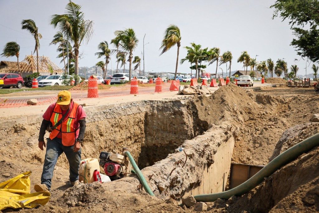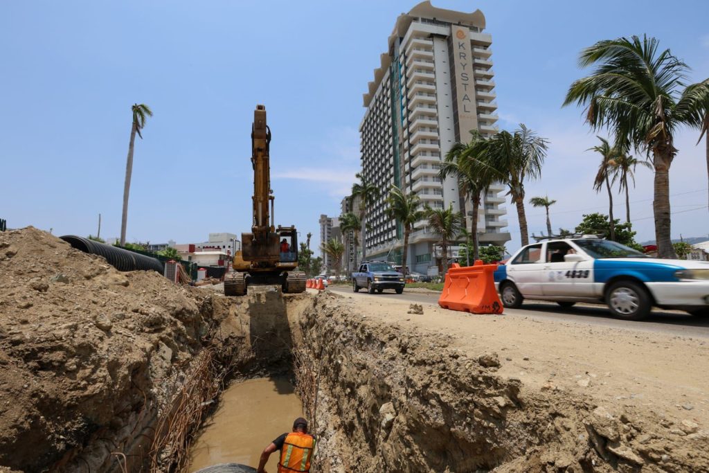 En cuanto al tema de saneamiento, se han llevado a cabo obras en los colectores Caleta, Aguas Blancas-Sonora, Papagayo, Nao Trinidad-Cuauhtémoc, Base Naval-Nao Trinidad, Miramar, Diamante, Mala Espina-Diego Hurtado; intervenciones en el Drenaje Sanitario Cereso, en los cárcamos de bombeo Mayan Palace y Mala Espina, así como en las plantas tratadoras de aguas residuales Aguas Blancas, Pie de la Cuesta, Miramar, Renacimiento y Diamante.