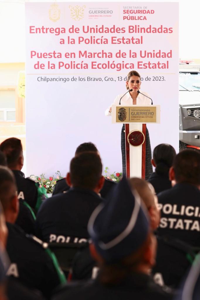 La mandataria estatal puntualizó que la integración de esta unidad de la policía y el equipamiento histórico de unidades que se hace a la institución encargada de la seguridad del estado, se refrenda el compromiso de este gobierno con el mensaje claro de no dar ni un paso atrás en el objetivo de construir un Guerrero en paz, con bienestar para todas y todos.