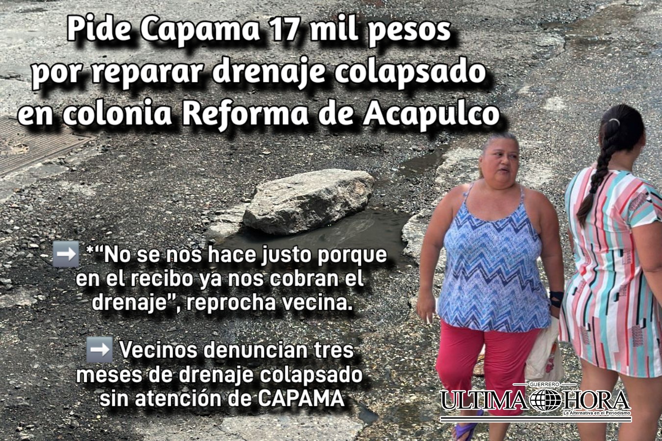 Acapulco; Gro,. A 21 de septiembre del 2025.- Vecinos de la colonia Reforma Los Naranjos, en Acapulco, denunciaron que desde hace tres meses padecen una fuerte afectación por el colapso del drenaje en su calle, sin que trabajadores de la Comisión de Agua Potable y Alcantarillado del Municipio de Acapulco (CAPAMA) hayan atendido el problema, pese a los múltiples reportes realizados.
