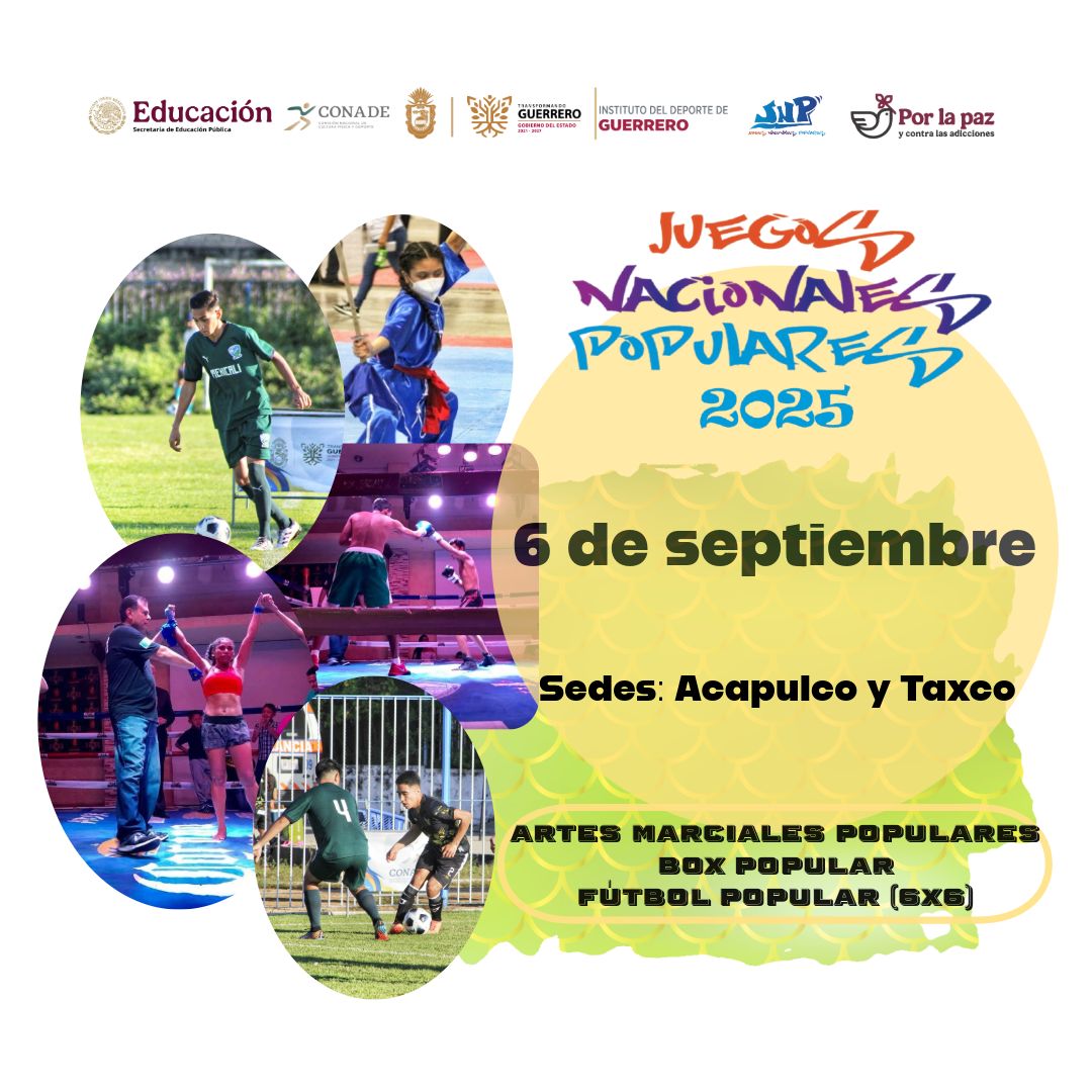 Chilpancingo, Gro., 28 de agosto de 2025.- La titular del Instituto del Deporte de Guerrero (INDEG), Alma Rocío López Bello, dio a conocer que la fase estatal para participar en “Los Juegos Nacionales Populares 2025”, se realizará el día 6 de septiembre y tendrá como sedes el puerto de Acapulco y la cuidad platera de Taxco, donde se desarrollarán las justas deportivas que darán paso a atletas guerrerenses al vento nacional que realiza la CONADE.