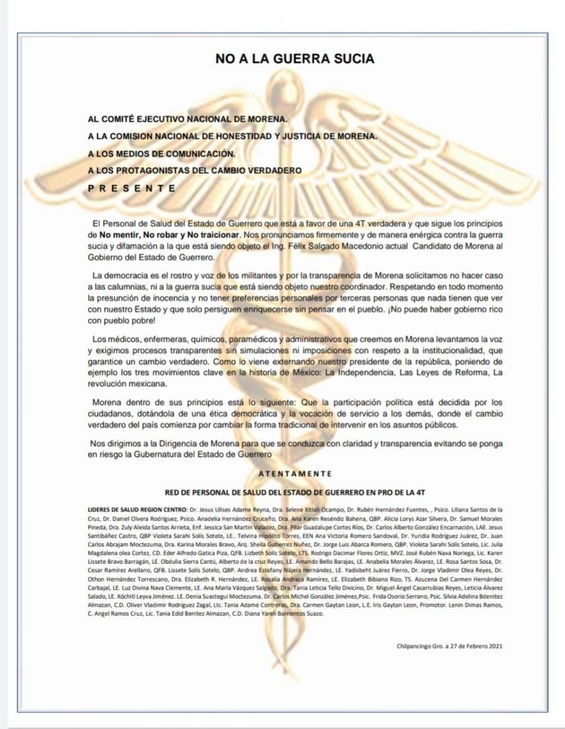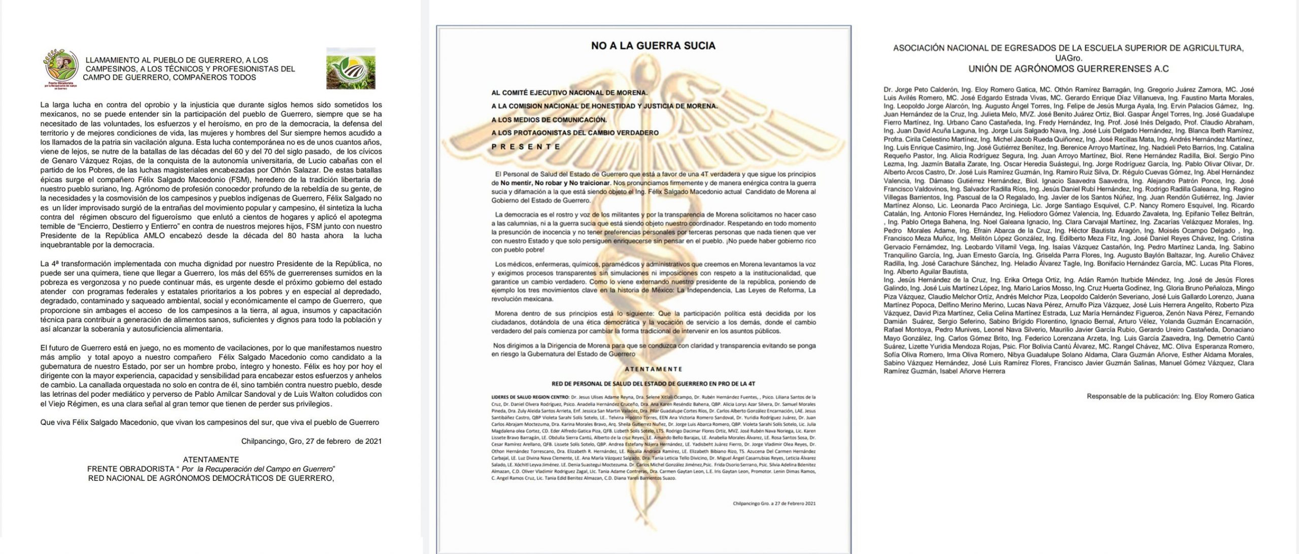A través de un posicionamiento público, aseveraron que la guerra sucia contra Salgado Macedonio es una “canallada orquestada no solo en contra de él, sino también contra el pueblo de Guerrero, desde las letrinas del poder mediático y perverso de Pablo Amílcar Sandoval y Luis Walton”.