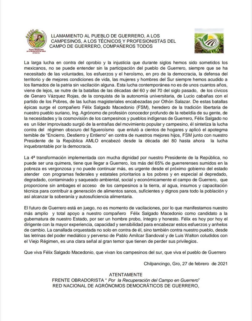 Además, señalaron que, como ingeniero agrónomo de profesión, “es un conocedor profundo de la rebeldía de su gente, de las necesidades y la cosmovisión de los campesinos y pueblos indígenas de Guerrero”.