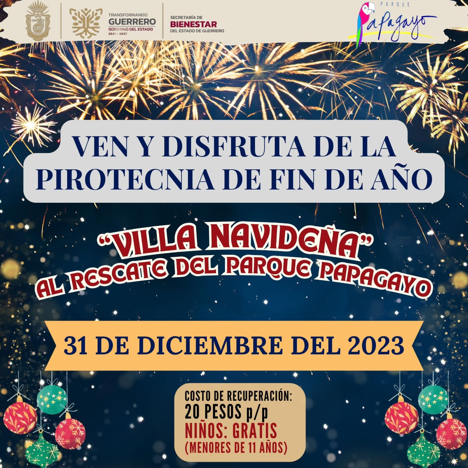 Informó que la Villa Navideña estará abierta al público este fin de año para que todas las familias puedan disfrutar no sólo de los fuegos artificiales, sino también de todo lo que está ofreciendo el Parque Papagayo, desde el juego de lotería, actividades lúdicas para niños y niñas, el emblemático trenecito, cenas, snacks y muchas sorpresas que se han desarrollado en los días que lleva instalada la atracción.
