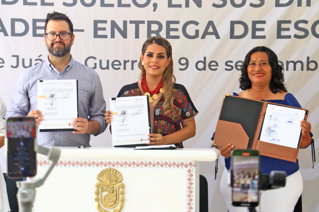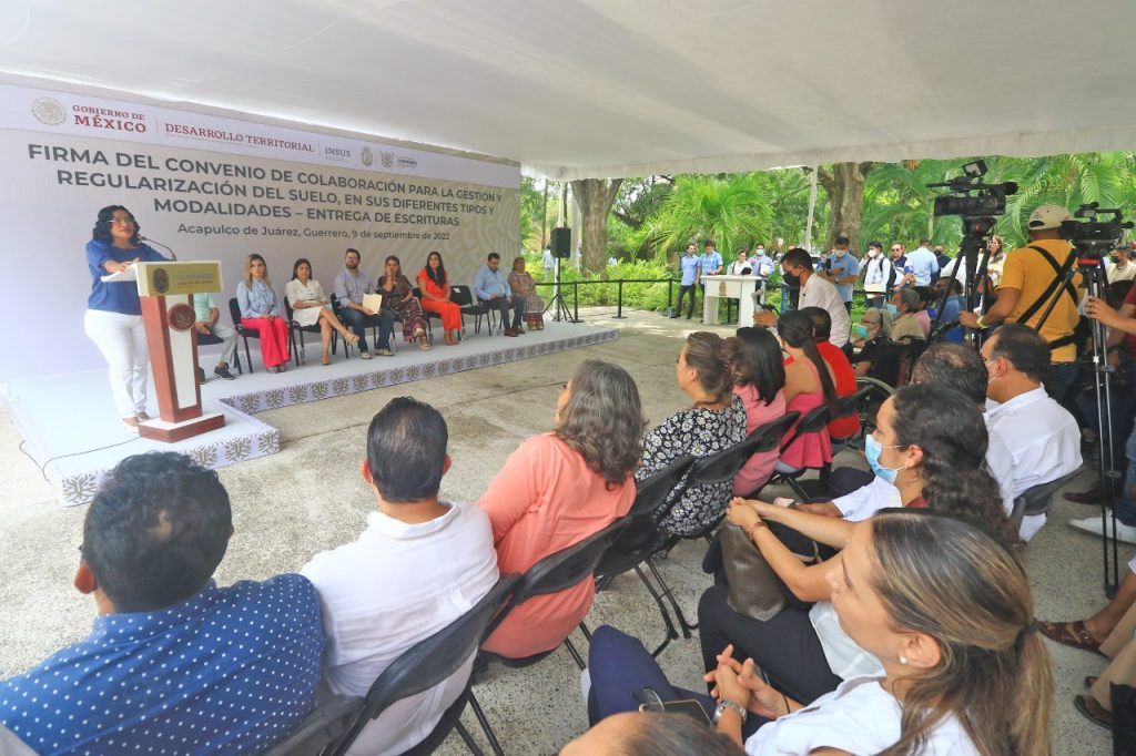 Acapulco, Gro., 09 de septiembre de 2022.- La presidenta municipal de Acapulco, Abelina López Rodríguez, participó en la “Firma de Convenio de Colaboración para la Gestión y Regularización del Suelo en sus Diferentes Tipos y Modalidades – Entrega de Escrituras”, entre el Instituto Nacional del Suelo Sustentable (INSUS) y el gobierno de Guerrero, evento encabezado por la mandataria estatal, Evelyn Salgado Pineda.