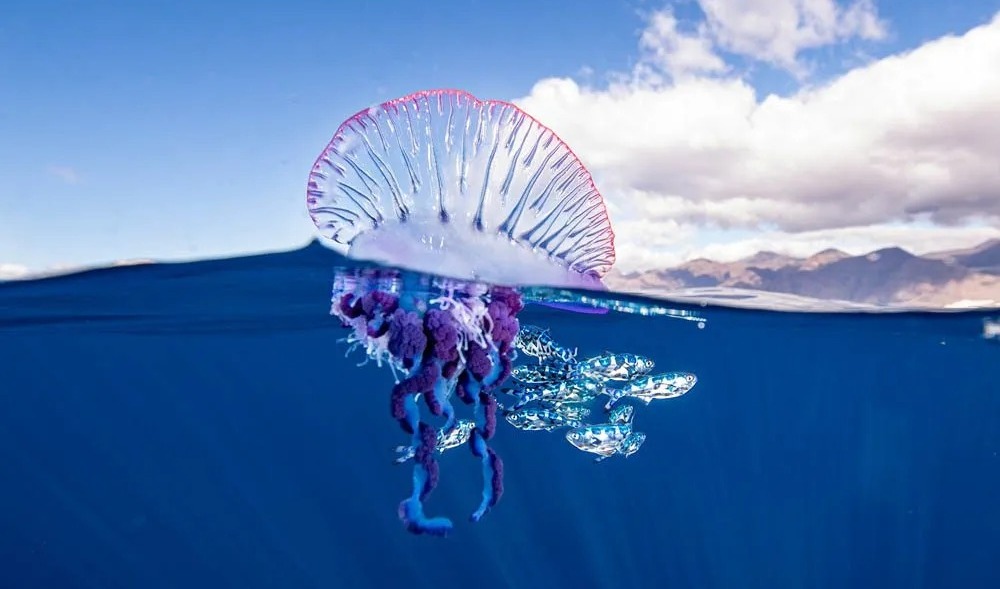 La Fragata Portuguesa (Physalia physalis) una especie colonial monotípica de hidrozoo sifonóforo de la familia Physaliidae, que se suele encontrar en mar abierto en todas las aguas cálidas del planeta, arribando al puerto por las corrientes marinas. No atacan, pero el contacto con ellas suele provocar reacciones en la piel humana, por lo que es importante acudir con el médico.