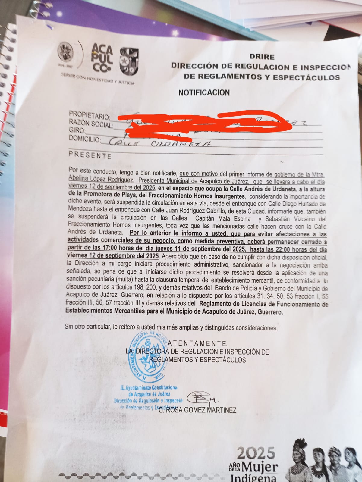 Acapulco, Gro., a 03 de septiembre de 2025.- Locatarios de la avenida Urdaneta en el puerto, expusieron que la dependencia de Reglamentos y Espectáculos intentará cerrar locales comerciales y establecimientos por motivo de celebración política del Informe de Gobierno de Abelina López.