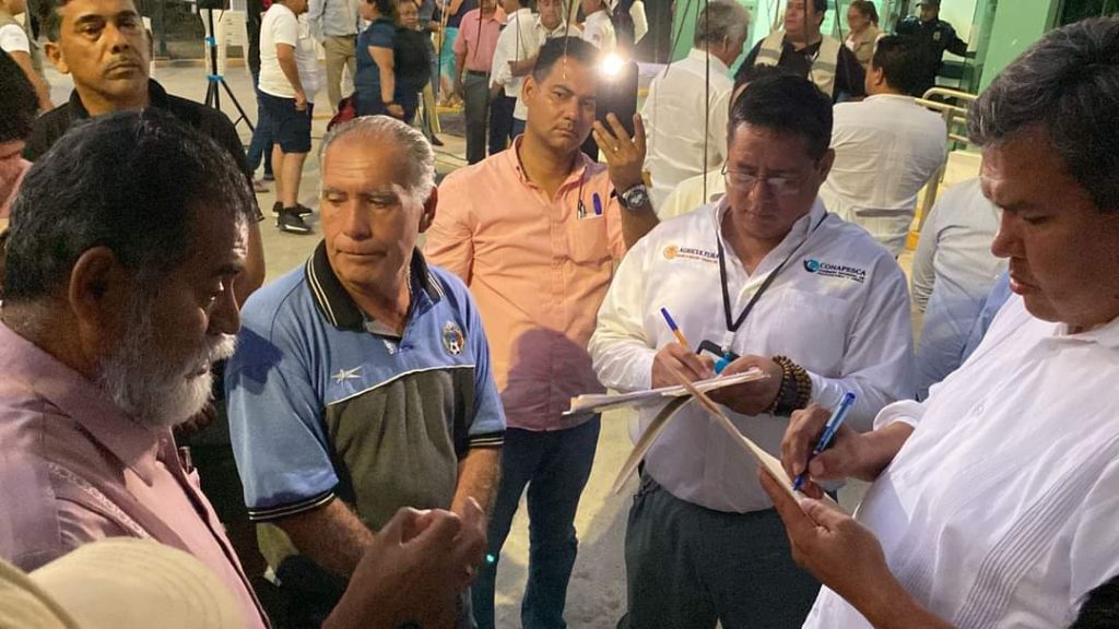 Luego de que el funcionario federal estuvo presente en la Asamblea del Comité de Programas para el Bienestar en la sucursal de Ixtapa por la tarde, los hombres de mar encabezados por Florentino Zavala Clímaco, Elías Gutiérrez Núñez, José Santos Torres Rosales, Jesús Torres y Leonardo Ramírez, entregaron el documento en el que piden un ordenamiento pesquero para que todas las embarcaciones sean incluidas en los permisos de pesca de las cooperativas.