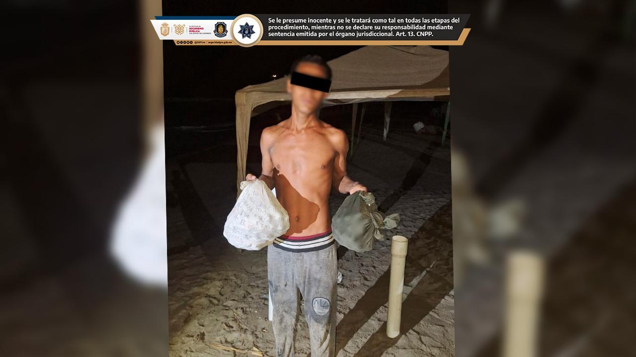Durante recorridos de seguridad y vigilancia enfocados a la preservación de quelonios marinos, personal policial ubicó en el acceso de playa La Torre, colonia Granjas del Marqués, a un hombre que sustraía huevos de un nido de tortuga marina. Tras una inspección preventiva, fueron asegurados 247 huevos y se realizó la detención del masculino.