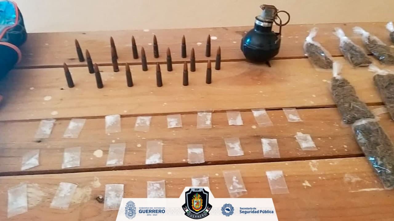 Chilpancingo, Guerrero, 05 de noviembre de 2020.- Como resultado de recorridos de prevención del delito, elementos de la Policía Estatal aseguraron cartuchos útiles, una granada, presunta droga y una motocicleta en el municipio de Acapulco de Juárez.