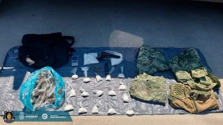 Los dos individuos, la presunta droga, el arma, cartuchos, el vehículo y los uniformes tipo militar fueron puestos a disposición de las autoridades correspondientes.