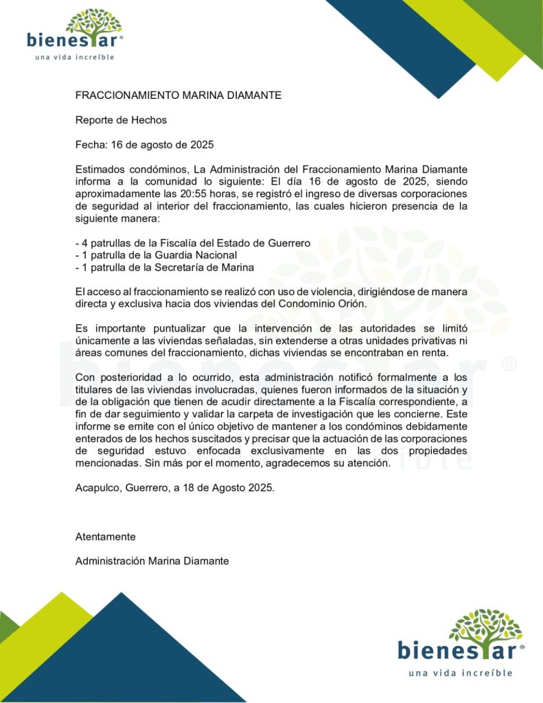 Mientras que la Administración de Marina Diamante mandó el día de ayer un comunicado a los demás socios, en donde aseguran que el acceso de las patrullas y unidades de las autoridades entraron con uso de violencia. Y que estos se habían dirigido directa y exclusivamente a dos propiedades de un mismo condómino.