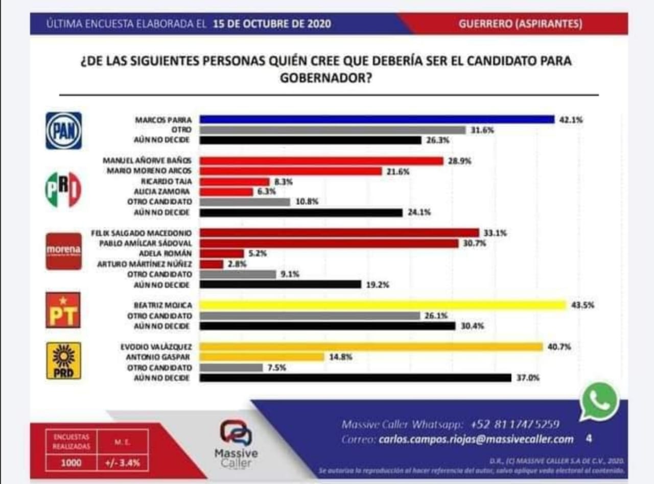 En el caso de los otros partidos Massive Caller puso como punteros del PAN a Marcos Parra, el alcalde taxqueño; al senador Manuel Añorve en el PRI; al senador con licencia Félix Salgado en Morena y a la excandidata a la gubernatura Beatriz Mojica por el PT.
