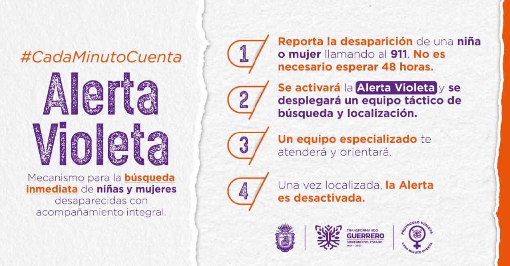Bajo el esquema “Cada minuto cuenta”, la Alerta Violeta es el nuevo operativo de búsqueda de niñas y mujeres desaparecidas en Guerrero y es el primer mecanismo del país que no requiere una denuncia ante el Ministerio Público, ya que para activarse solo se requiere la denuncia a través del número de emergencias 911.