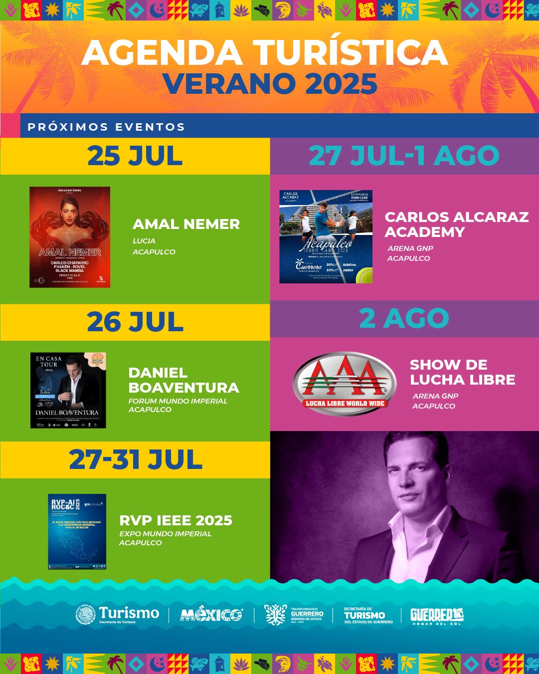 Además, estará Amal Nemer el 25 de julio en Acapulco; Daniel Boaventura En Casa Tour 2025 el 26 de julio en Fórum Mundo Imperial; Carlos Alcaraz Academy del 27 de julio al 1 de agosto en Arena GNP; RVP IEEE 2025 del 27 al 31 de julio en Expo Mundo Imperial de Acapulco.