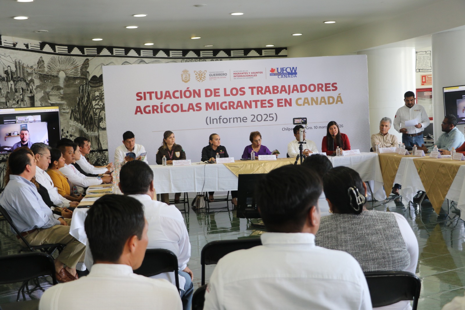 Chilpancingo, Gro., 11 de marzo de 2026.- Con el objetivo de visibilizar las condiciones laborales de las y los jornaleros migrantes guerrerenses y fortalecer la defensa de sus derechos, como lo ha promovido la gobernadora Evelyn Salgado Pineda, se llevó a cabo la presentación del informe “La situación de los trabajadores agrícolas migrantes en Canadá 2025”, documento que expone los principales retos y avances en materia de protección laboral en ese país, documento elaborado por el sindicato United Food and Commercial Workers Union (UFCW) Canadá.