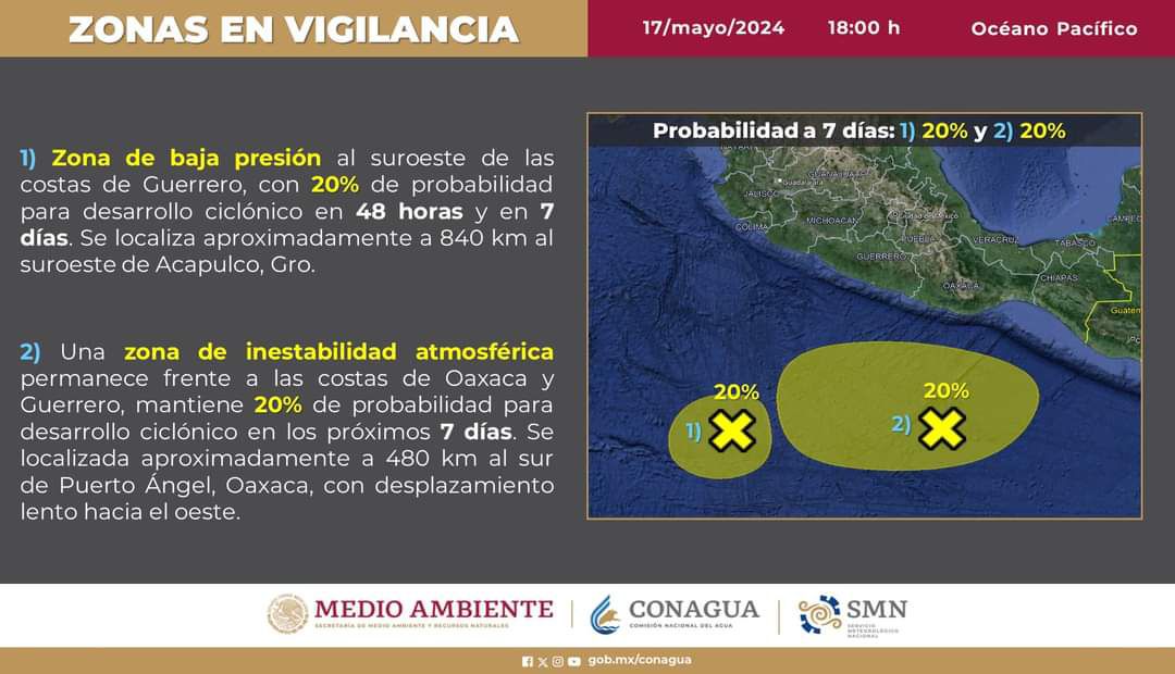Una de las zonas de baja presión se encuentra a 840 kilómetros al suroeste de Acapulco y se aleja lentamente de costa mexicana. Mientras que la segunda está a 480 kilómetros al sur de Puerto Ángel, Oaxaca y mantiene un desplazamiento similar.