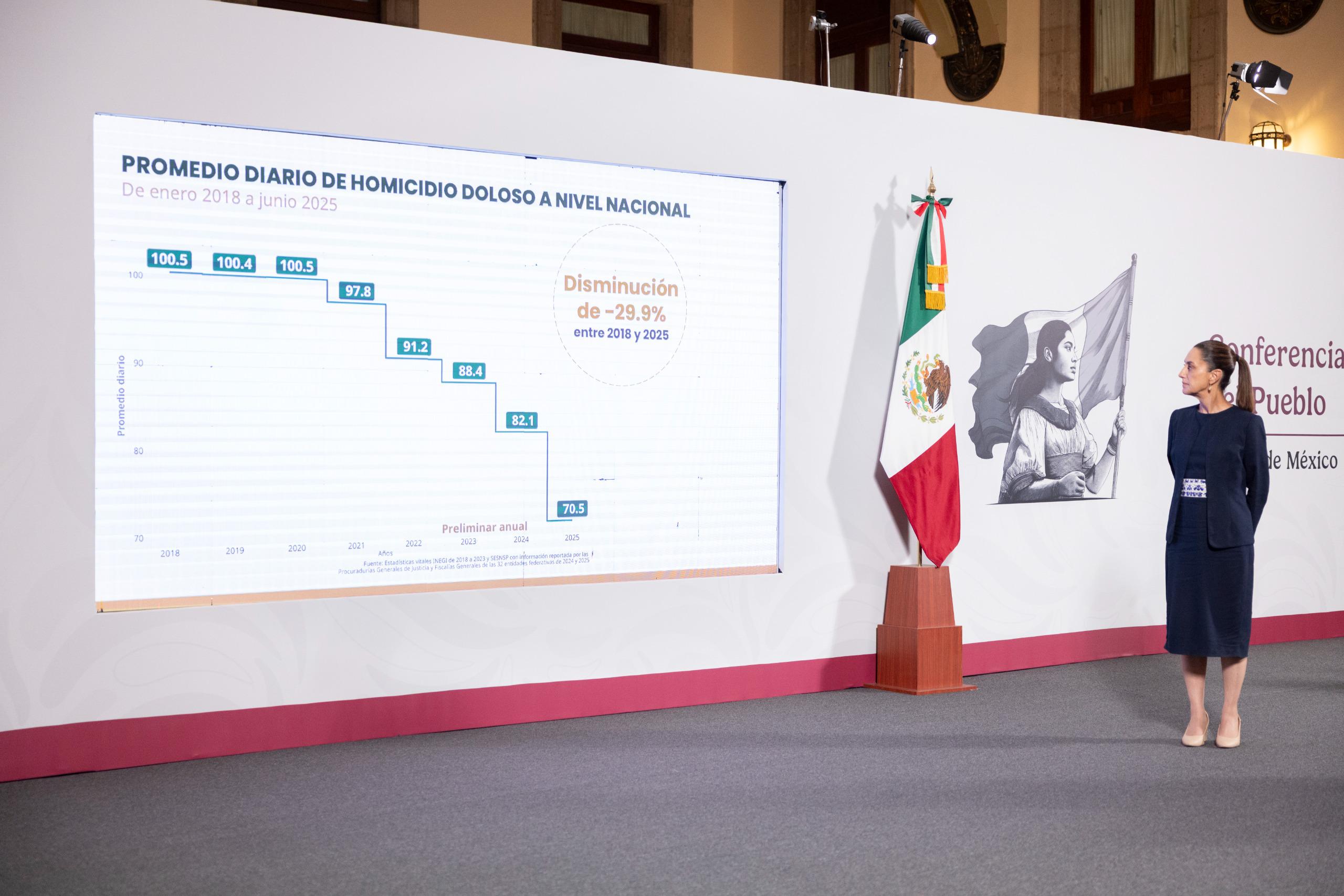 La Presidenta de México, Claudia Sheinbaum Pardo, destacó que el primer semestre de 2025 es el semestre con menos homicidios dolosos desde 2016 y aseguró que este delito continuará reduciendo gracias a la implementación de la Estrategia Nacional de Seguridad.