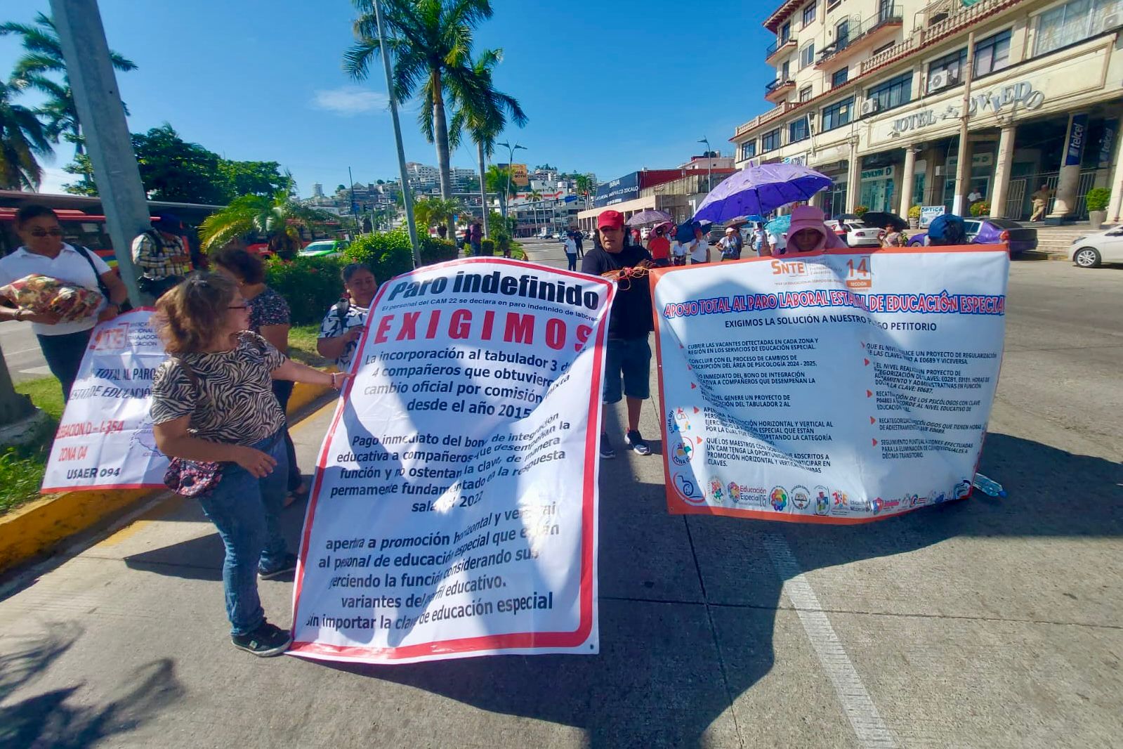 Acapulco; Gro.- Por tercer día consecutivo, profesores de Educación Especial en Guerrero realizaron un bloqueo en la avenida Costera Miguel Alemán para exigir el pago del bono a la Integración Educativa y regularización del personal.