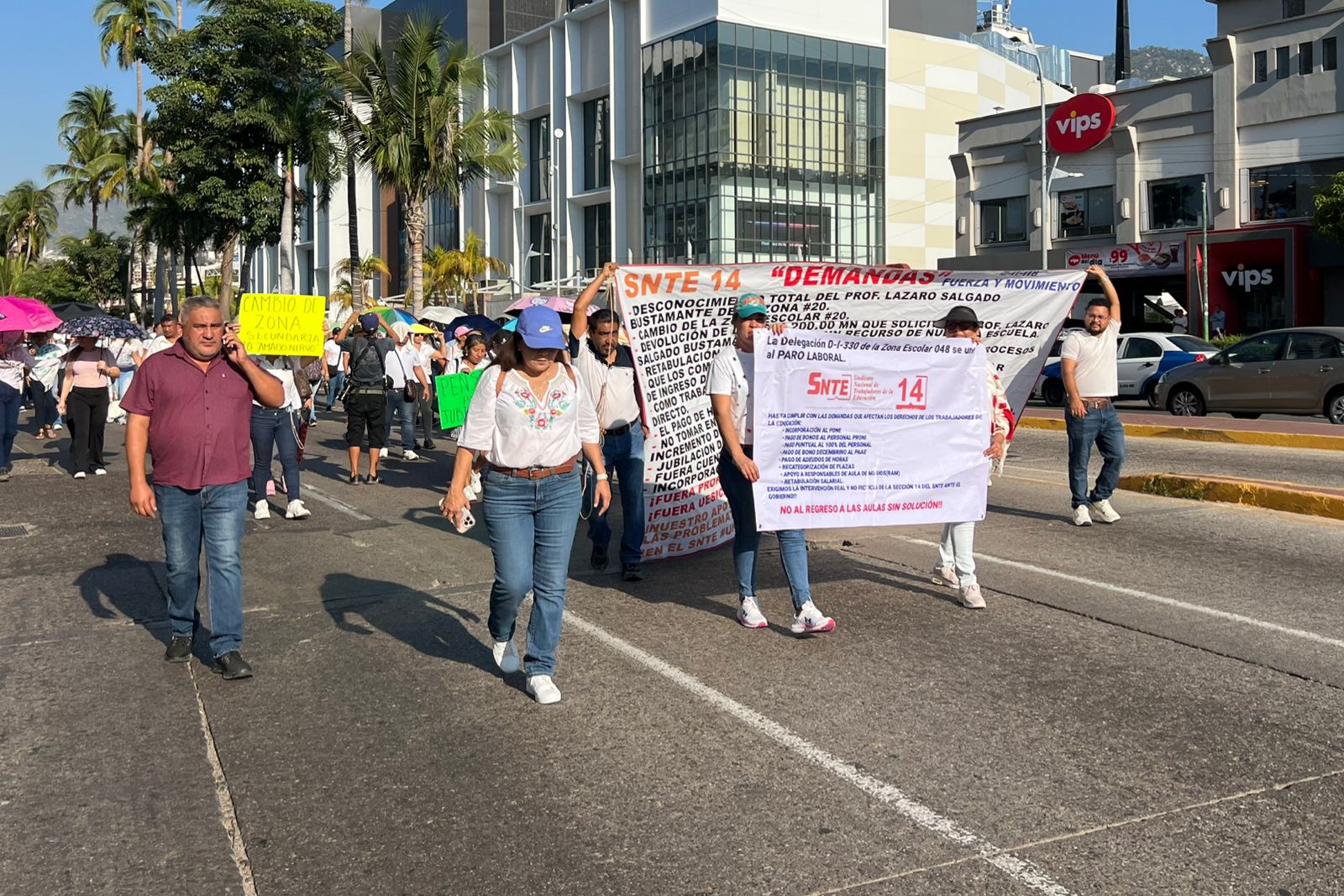 Acapulco; Gro.- Profesores de distintas zonas escolares del puerto de Acapulco, realizaron una marcha por la avenida Costera Miguel Alemán de Acapulco para exigir a las autoridades educativas se dé una respuesta favorable a los 14 puntos estipulados en su pliego petitorio.