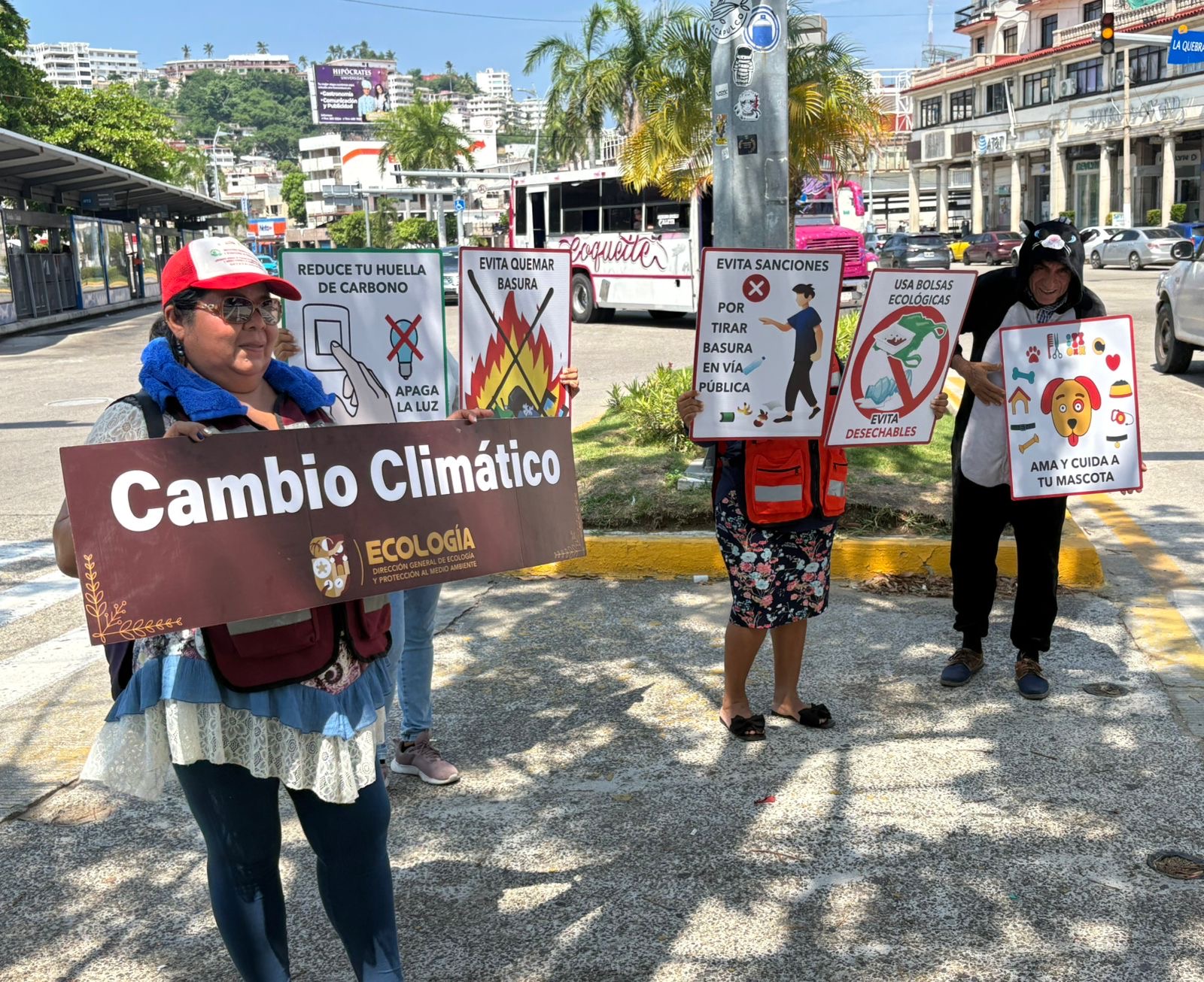 En la avenida Costera Miguel Alemán a la altura de la colonia Centro, personal de la Dirección de Ecología y Protección al Medio Ambiente emitió mensajes a la población como no quemar basura, no tirar desechos en vía pública, no usar recipientes de un solo uso. Asimismo, con un personaje, se llama a los más pequeños a cuidar a los animales de compañía.