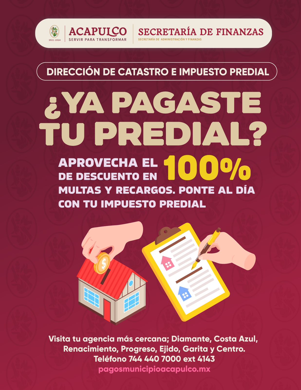 A través de la dirección de Catastro e Impuesto Predial, se aplicará un 100 por ciento de descuento, por ello, se exhorta a las y los ciudadanos a visitar su agencia recaudadora más cercana, ubicadas en la zona Diamante, Costa Azul, Ciudad Renacimiento, Progreso, Ejido, Garita y Centro.