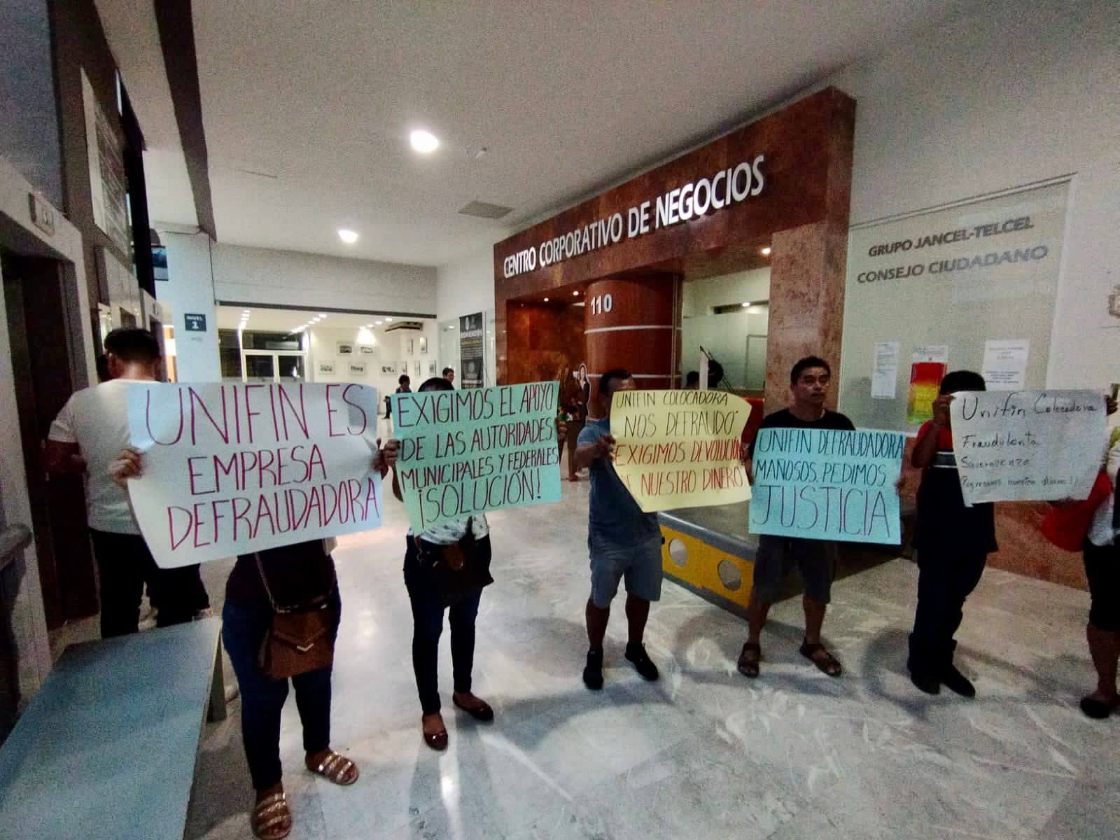 “La empresa UNIFIN que se decía era una empresa colocadora, me pidieron primero 20 mil pesos y después me solicitaron 17 mil 410 pesos como un monto revolvente, cosa que fue una mentira. De ahí me turnaron a otro ejecutivo y me solicito darles 19 mil pesos, me están llamando para hostigarme que les entregue mis propiedades, este dinero lo iba a invertir en mi negocio”, señaló uno de los afectados.
