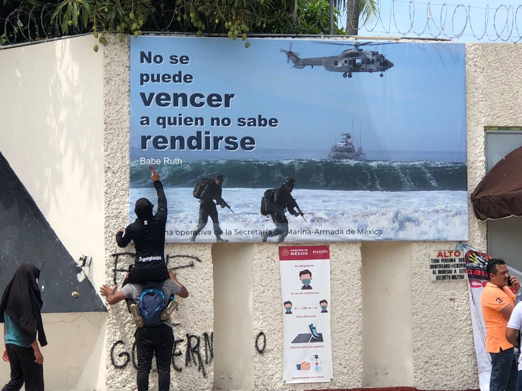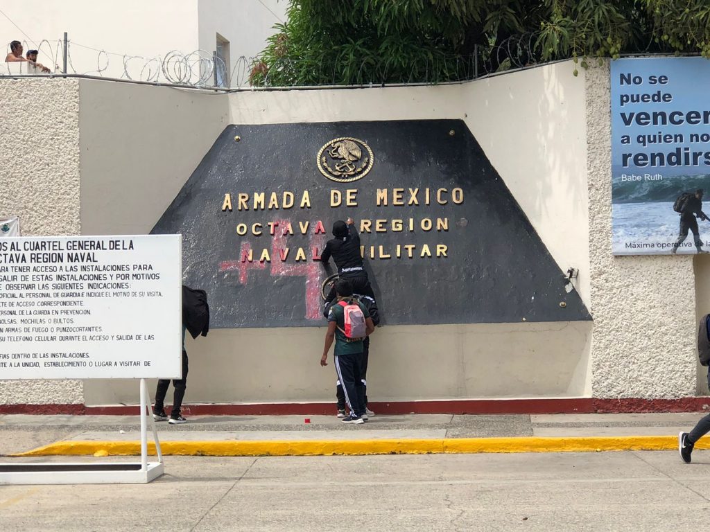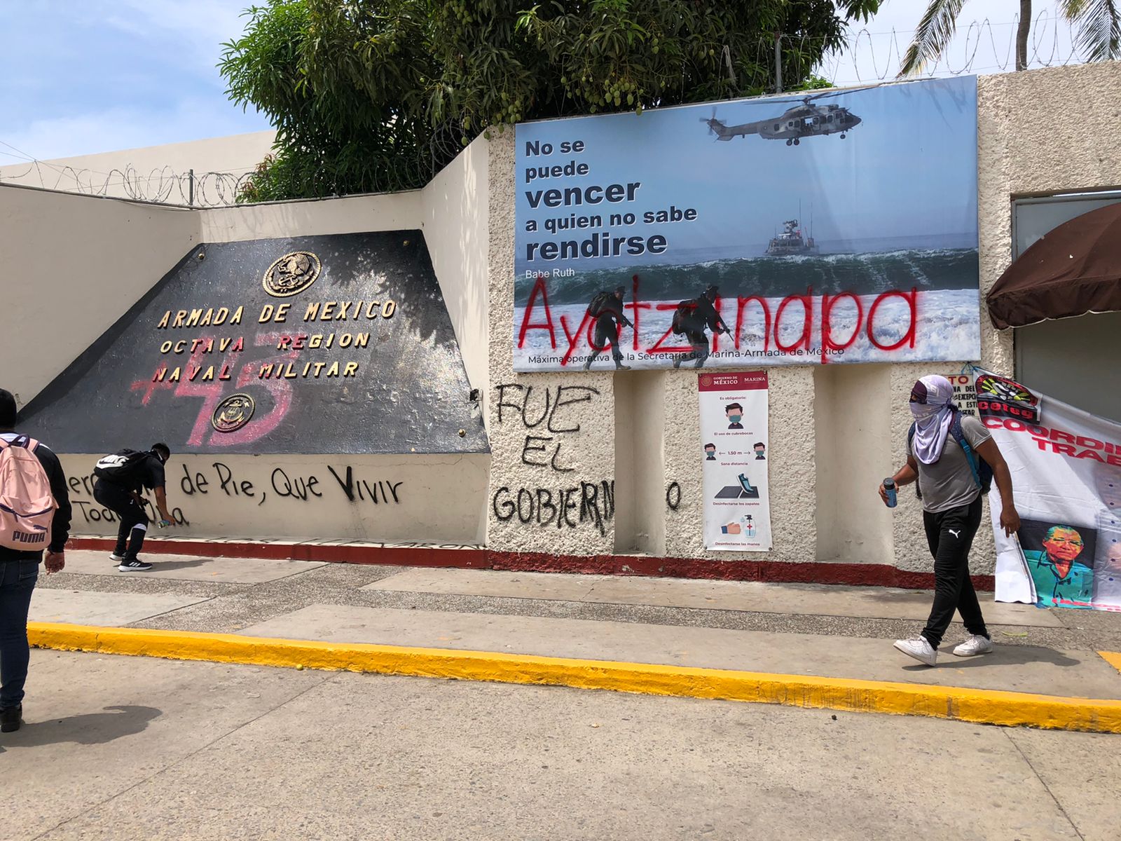Al poco tiempo después, algunos maestros ingresaron con bats y tubos para hacerse de palabras con los marinos, mientras a las afueras los estudiantes de Ayotzinapa realizaron pintas en toda la fachada.