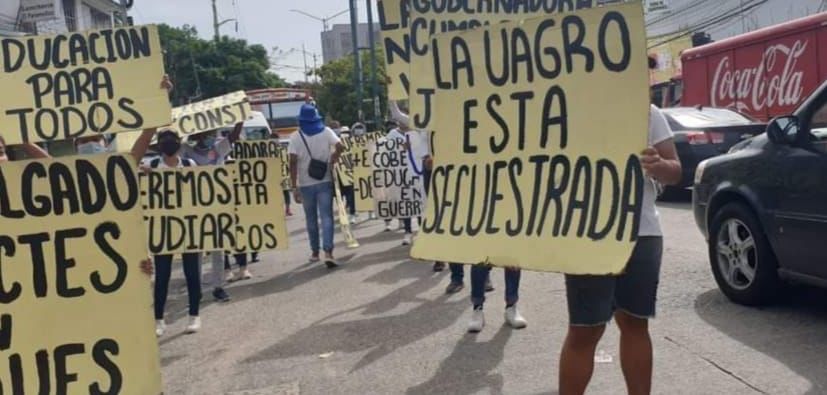 El grupo de jóvenes manifestantes portaban cartulinas donde se podían leer consignas como “La UAGro no se vende”, “Coordinadora Universitaria”, “Educación para todos” y “La UAGro esta secuestrada”, exigieron además se de una reunión con la Gobernadora Evelyn Salgado Pineda para exponer sus demandas y así obtener espacios en las instituciones de la salud de la universidad.