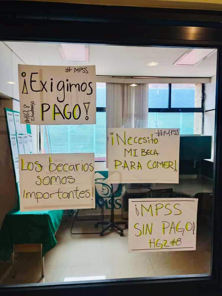 Los médicos manifestantes colocaron letreros en la entrada de la jefatura de enseñanza frente a la sub dirección médica, en el interior de la clínica del IMSS en este puerto, donde demandaron el pago de sus salarios, escribiendo frases como: “Los becarios somos importantes”, “Exigimos pago”, “Necesito mi beca para comer” y “MPSS sin pago”.