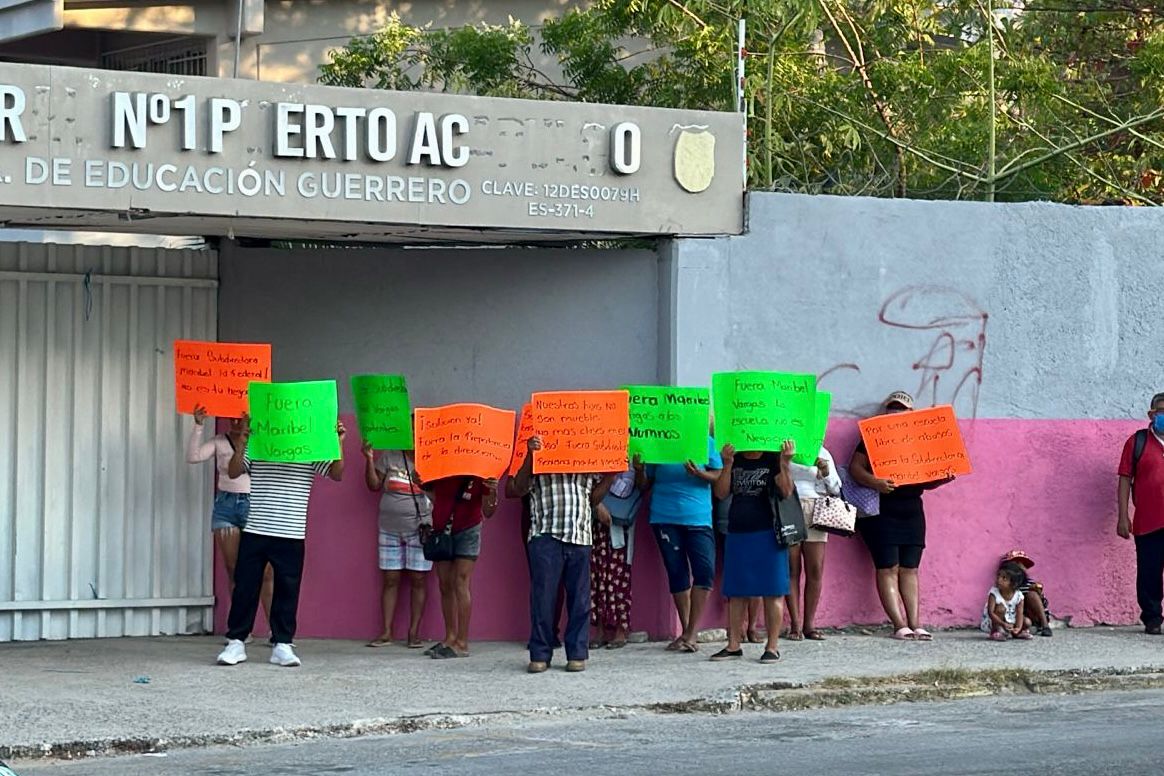 Acapulco; Gro,. A 17 de marzo del 2026.- Padres de familia de la Escuela Secundaria Federal No. 1 “Puerto Acapulco”, realizaron una protesta y colocaron mantas a las afueras del plantel educativo para exigir la destitución de la subdirectora del turno matutino, Roxana Maribel Vargas Castillo.