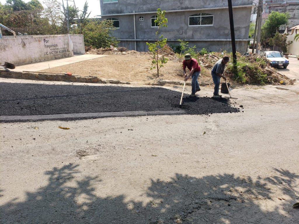 Las cuadrillas de la Dirección de Maquinaria Pesada; realizaron trabajos de reposición de concreto asfáltico en la colonia 20 de noviembre, a la altura de la cancha de basquetbol sobre la calle Benito Juárez.