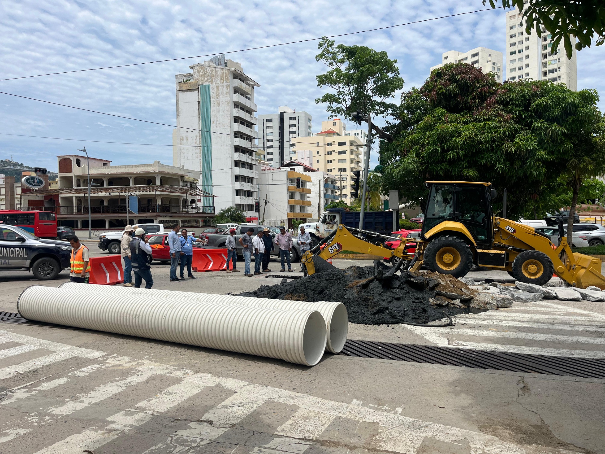 Apoyados por maquinaria pesada, el personal operativo inició la excavación de la zona donde será colocado el nuevo tubo de Novafort, el cual sustituirá al de concreto que prácticamente se desintegró a lo largo de los años, estos trabajos se llevan a cabo en la costera Miguel Alemán, a la altura de lo que fue el Centro Internacional Acapulco.