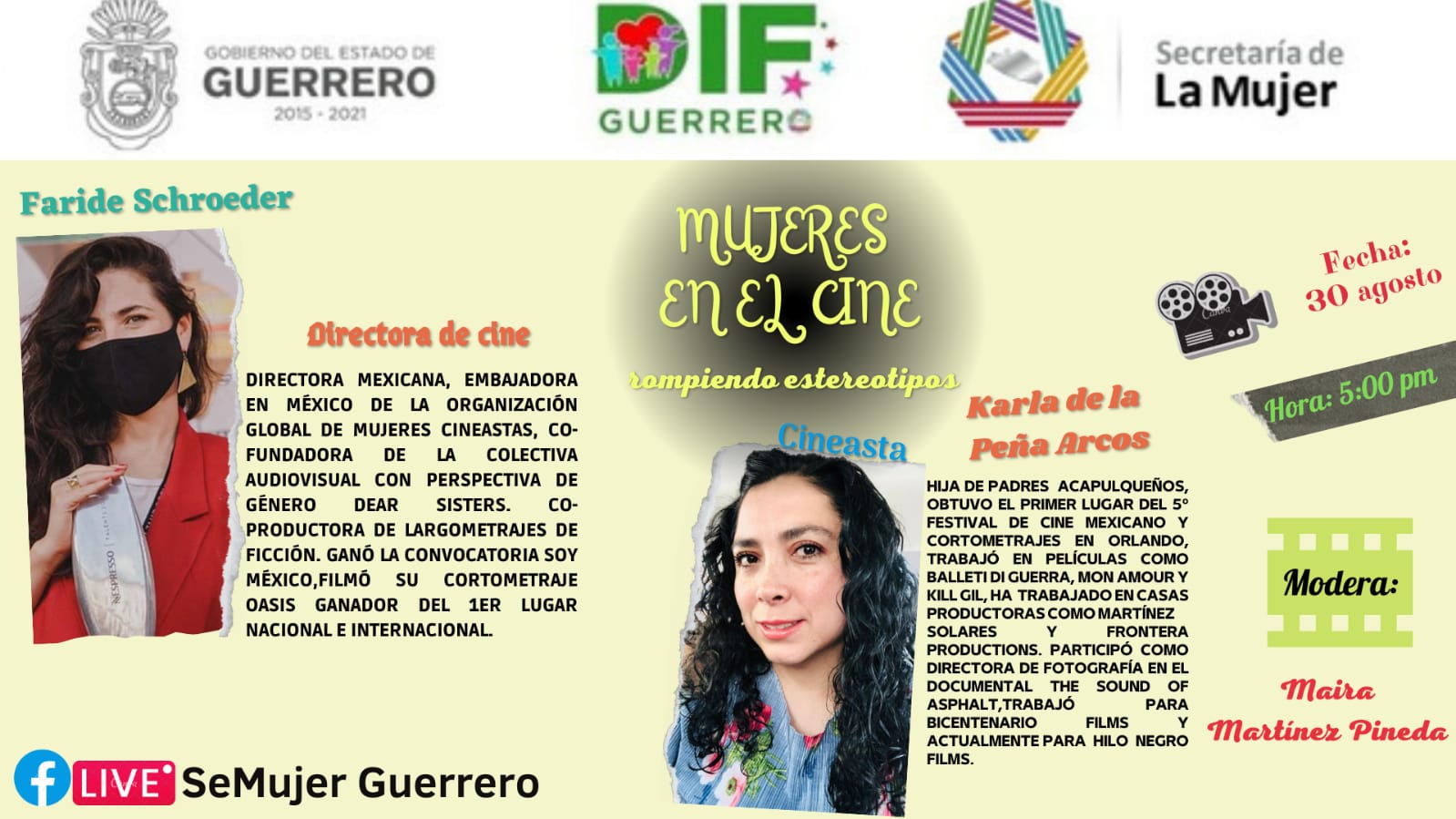 Chilpancingo, Gro., 31 de agosto de 2021.-El gobierno del estado estado a través de la Secretaría de la Mujer en coordinación con el DIF Guerrero, llevaron a cabo la plática “Mujeres en el Cine rompiendo Estereotipos”, en la cual se contó como invitadas con las cineastas Karla de la Peña Arcos y Faride Schroeder, de quienes la titular de la Semujer, Maira Martínez Pineda destacó su talento e incursión en este ámbito, siendo inspiración para otras mujeres.